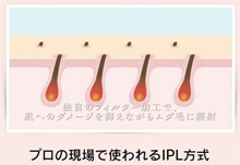 実際の脱毛サロンで使用されているIPL(インテンス・パルス・ライト)方式という光脱毛を採用しています。